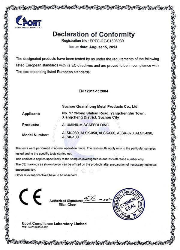 AG九游会·(官方网站)-首页专注铝合金制品的开发“产品就是人品”的企业理念,不断进行技术创新、设备创新、服务创新、和管理方式创新来继续研发出更多满足未来发展需要的产品, 公司产品通过欧盟认证取得CE认证并取得证书,铝合金脚手架系列产品通过SGS认证,铝合金平台和梯具类产品均严格按照GB12142-2007,GB17888等标准设计生产。